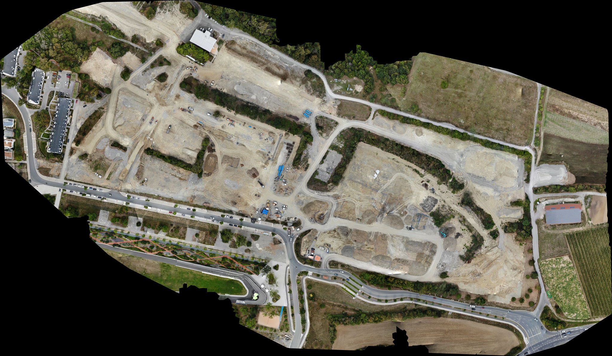 Aus den Drohnenaufnahmen können dann, je nach Flugauftrag, Digitale Orthophotos gerechnet werden. Ebenfalls ist die Nutzung von aus der Datengrundlage generierten Punktwolken beispielsweise für die Erstellung von Digitalen Geländemodellen oder 3D-Modellen möglich. Auf Basis dieser Daten können dann volumentrische Berechnungen durchgeführt werden (z.B. Aushubvolumina von Gruben oder Haufwerken).